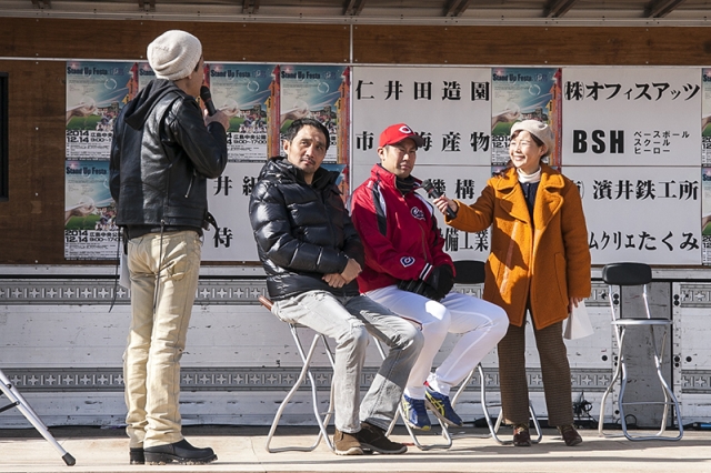 ステージ司会が西田篤史さん&松本裕見子さん。ゲストとしてカープの篠田純平投手、元カープ野手の木下富雄さん、元ボクシングミドル級世界チャンプの竹原慎二さん、地元で人気のある歌手の森本ケンタさんなどが参加。